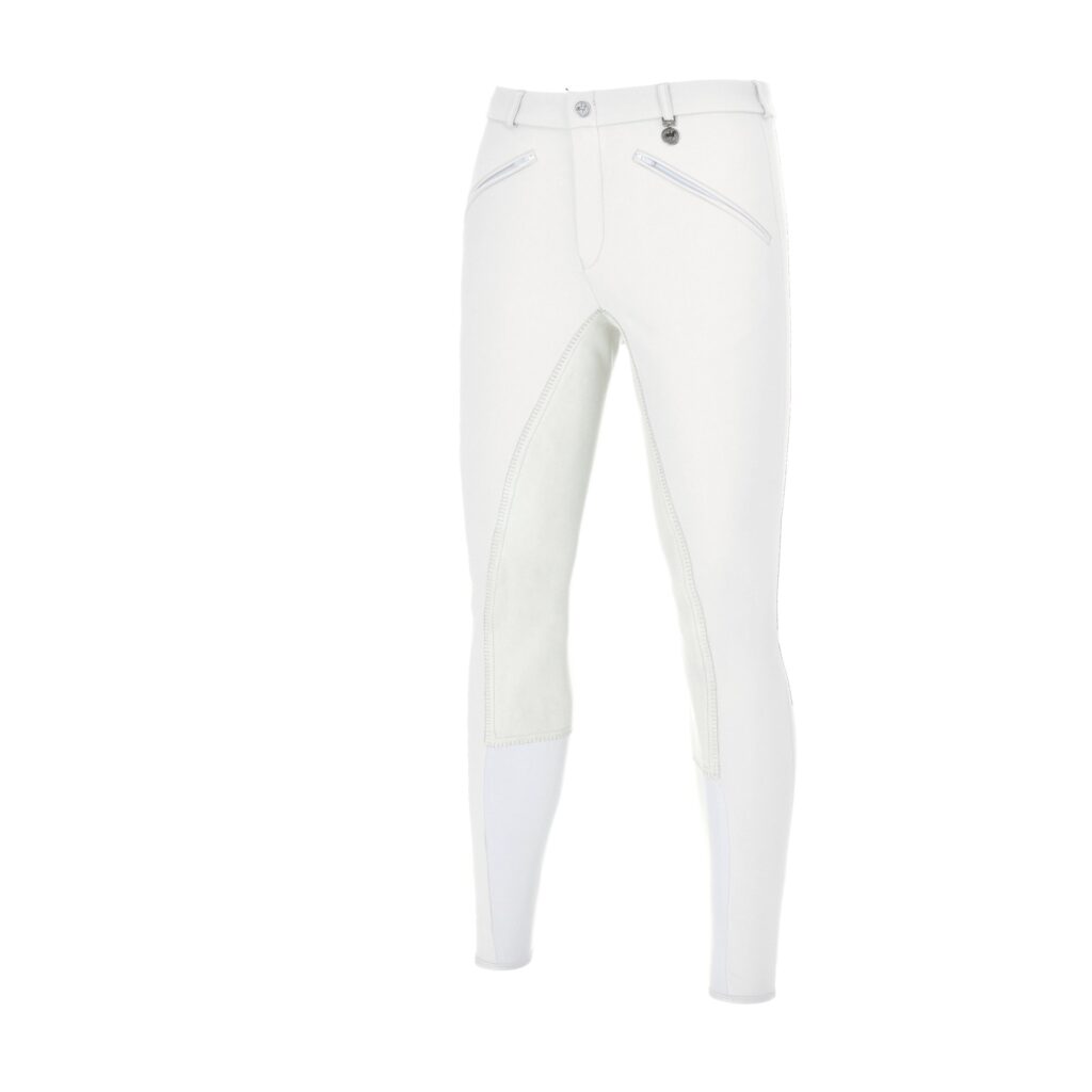 Nauwaansluitende rijbroek met flex faux leather zitvlak. Twee ritszakjes aan de voorzijde en elastische beenafsluiting.