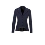Strass applicaties langs de tailleriem, kraag en frackpunten.