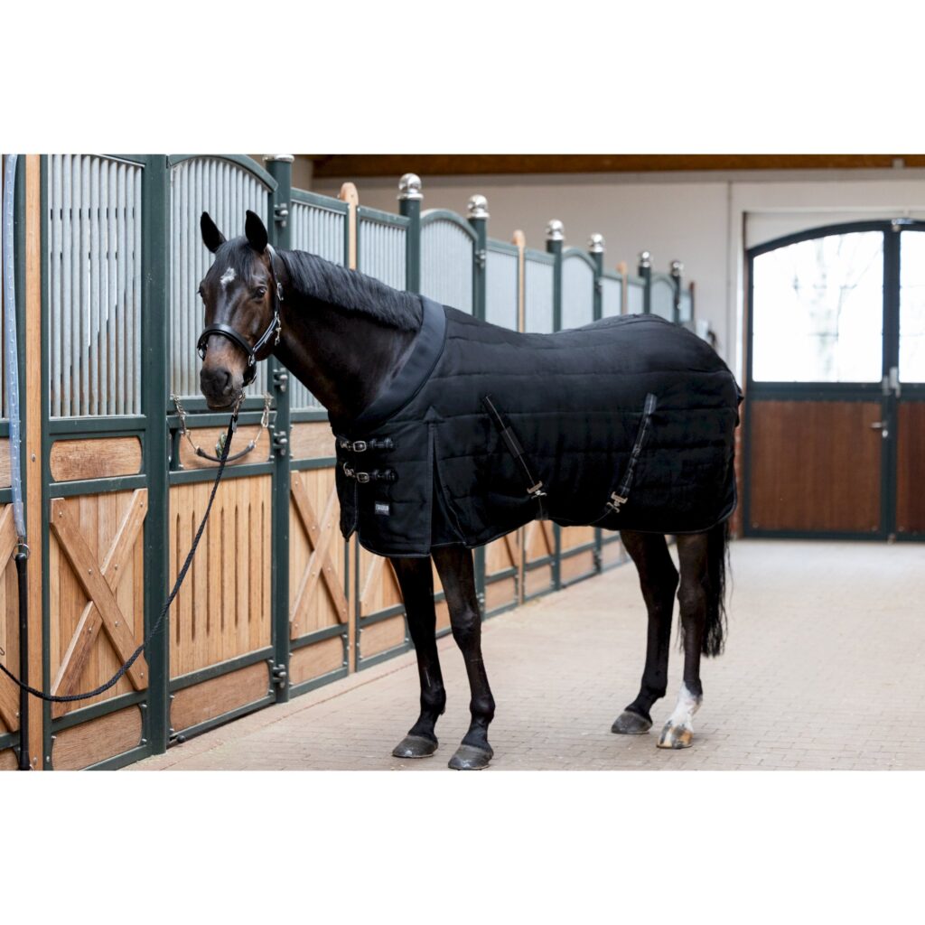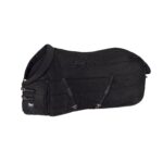 Het deken is voorzien van loopsplitten, dubbele en aanpasbare borstsluitingen, extra lange buiksingels, neoprene afwerking rondom de hals, een faux fur padding op de borst en een beschermde staartflap.